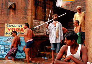 24 de agosto. Madrugamos para recorrer el Gangesen barca. Santones y peregrinos se bañan en las aguas del Ganges. En las orillas gentes de distintos pelajes realiza sus abluciones rituales. Otros queman a sus muertos en piras funerarias. Cuando desembarcamos nos acercamos a una de ellas donde rápidamente nos piden dinero. No nos permiten hacer fotos a menos que demos más dinero. Una mano se asoma entre la ardiente pira. Regresamos por las estrechas callejuelas adyacentes entre muertos en carros que esperan que la familia reuna el dinero para la madera necesaria.