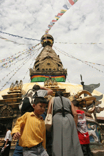 20 de agosto. Betsy nos enseña Kathmandu, su ciudad. Ha sido estudiante de la Universidad Complutense en España durante 9 años. Subimos a la colina donde vemos una gran stupa rodeada de cilindros de oraciones que los fieles hacen girar, eso vale por haber rezados mil veces. Unas mujeres preparan la comida para dioses y hombres bajo unos toldos que las envuelven en una luz mágica. Abajo, en la Plaza Real comienza la ceremonia anual de los muertos. Una leyenda de un rey que para consolar a su reina de la muerte del padre de ésta hizo desfilar a todos aquellos a quienes se les había muerto un ser querido durante el último año. Los parientes del finado debían llevar una vaca o un niño engalanado. La reina estará consolada pero la costumbre continua. Los viajeros, rodeados por ese tumulto, recorren el casco antiguo viendo el Kasta Mandap y el palacio de la Kumari Devi, la diosa viviente. Se dignó a mirarnos un instante. Es elegida con una serie de condiciones y superando unas pruebas y abandona el cargo cuando llega a la pubertad cuyo retraso merece todos los trucos. Betsy nos cuenta que sus paisanos varones son borrachos y vagos.
