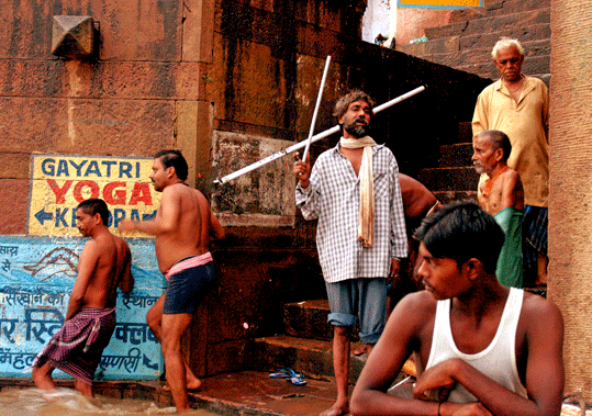 24 de agosto. Madrugamos para recorrer el Gangesen barca. Santones y peregrinos se bañan en las aguas del Ganges. En las orillas gentes de distintos pelajes realiza sus abluciones rituales. Otros queman a sus muertos en piras funerarias. Cuando desembarcamos nos acercamos a una de ellas donde rápidamente nos piden dinero. No nos permiten hacer fotos a menos que demos más dinero. Una mano se asoma entre la ardiente pira. Regresamos por las estrechas callejuelas adyacentes entre muertos en carros que esperan que la familia reuna el dinero para la madera necesaria.